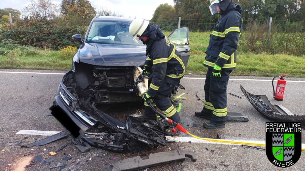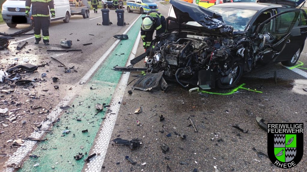 Nach einem Frontalzusammenstoß zweier PKW wurden wir zur Beseitigung von Betriebsstoffen auf die B67 gerufen, bei dem 2 Personen verletzt wurden. Die Feuerwehr Rhede stellte zudem noch den Brandschutz sicher und klemmte die Fahrzeugbatterien ab. Hierzu kam auch ein hydraulischer Spreizer zum Einsatz. Die B67 war für die Zeit der Rettungs- und Aufräumarbeiten in beiden Richtungen komplett gesperrt. (MF)