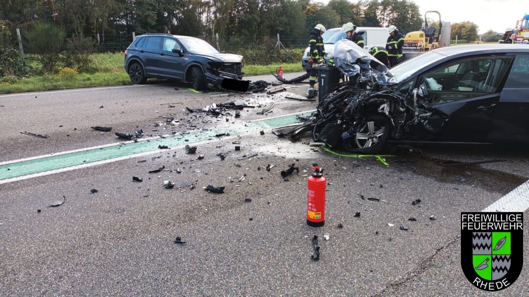 Nach einem Frontalzusammenstoß zweier PKW wurden wir zur Beseitigung von Betriebsstoffen auf die B67 gerufen, bei dem 2 Personen verletzt wurden. Die Feuerwehr Rhede stellte zudem noch den Brandschutz sicher und klemmte die Fahrzeugbatterien ab. Hierzu kam auch ein hydraulischer Spreizer zum Einsatz. Die B67 war für die Zeit der Rettungs- und Aufräumarbeiten in beiden Richtungen komplett gesperrt. (MF)